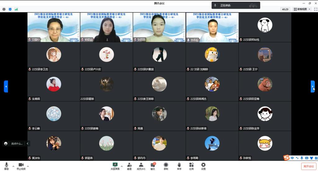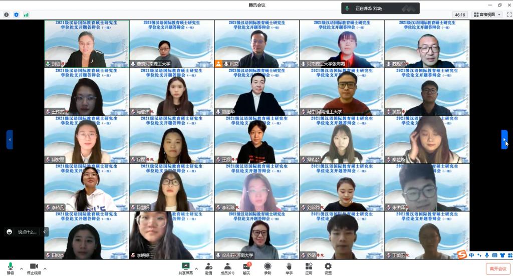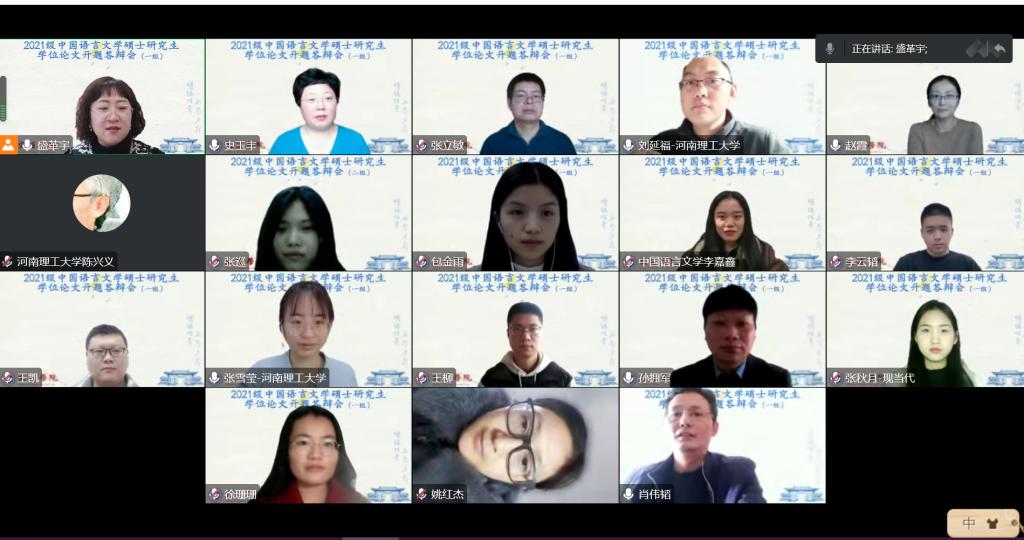 研究生学位论文开题是研究生培养工作的重要环节,是保证研究生学位论文质量的重要前提,为切实做好研究生学位论文指导工作,保证研究生培养质量,结合疫情防控工作要求,11月25日-11月29日,中国语言文学、汉语国际教育两个专业的2021级硕士研究生学位论文开题答辩会于云端顺利开展。为保证开题质量,此次开题根据专业方向分为四组,特邀中国艺术研究院研究员、教授张立敏、河南大学教授、博导辛永芬、河南师范大学教授连晓霞担任各组开题答辩评审。每位同学的开题包括个人汇报、专家质询与建议、学生答辩三项内容,时间不少于40分钟。