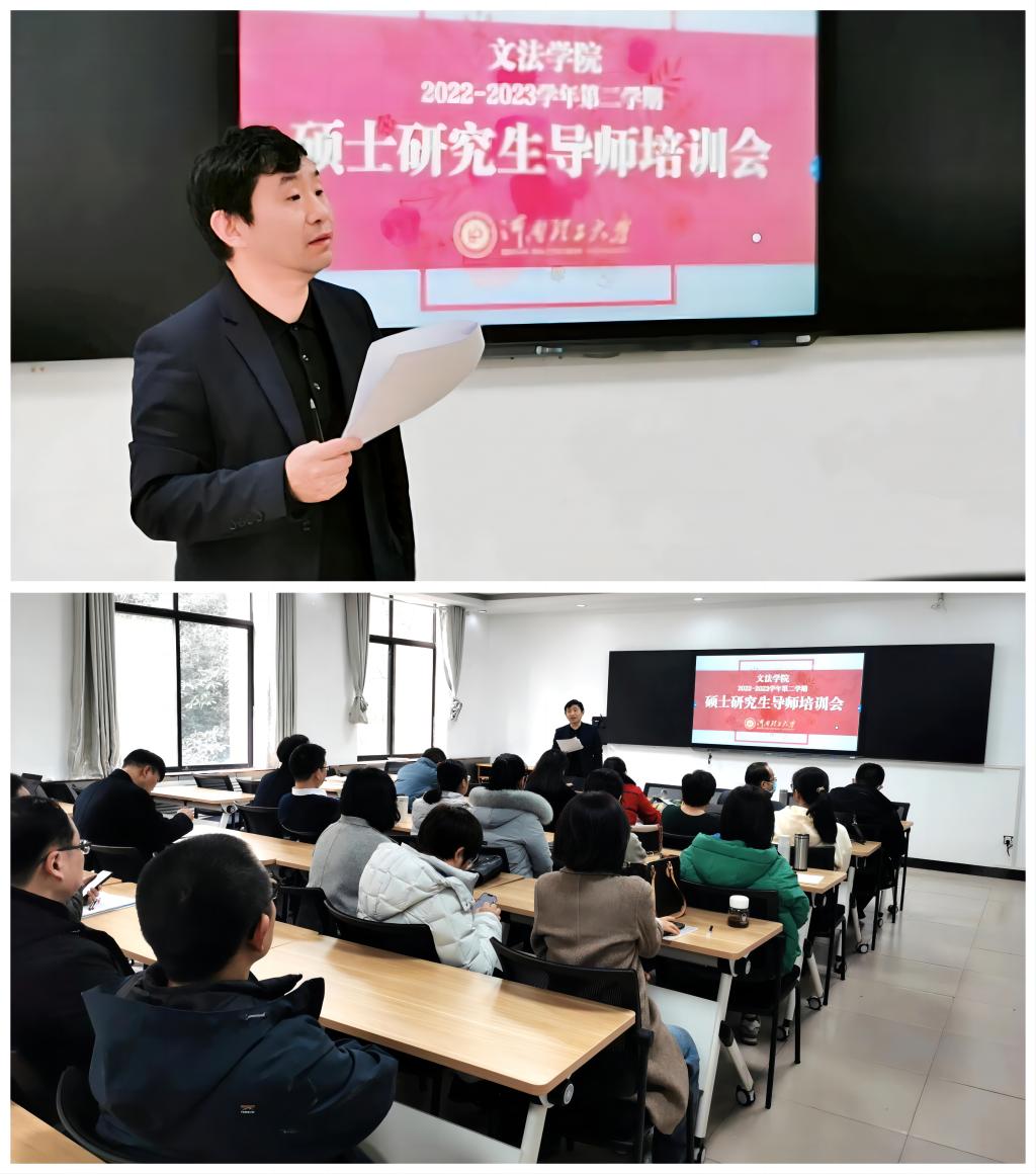 2月28日下午,我院在学院221多功能教室召开了2022-2023学年第二学期研究生指导教师培训会,就学位论文质量提升、研究生培养等问题对全体研究生指导教师进行了培训。培训由主管研究生工作副院长谢珺主讲。