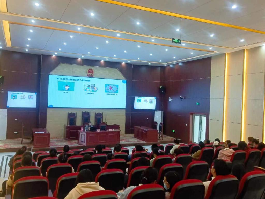 4月2日下午,文法学院于模拟法庭举办心理健康教育培训讲座,特邀心理咨询中心老师邱莎莎担任主讲,讲座题目为《大学生常见心理危机的识别和干预》,全体宿舍长及心理委员参加培训。