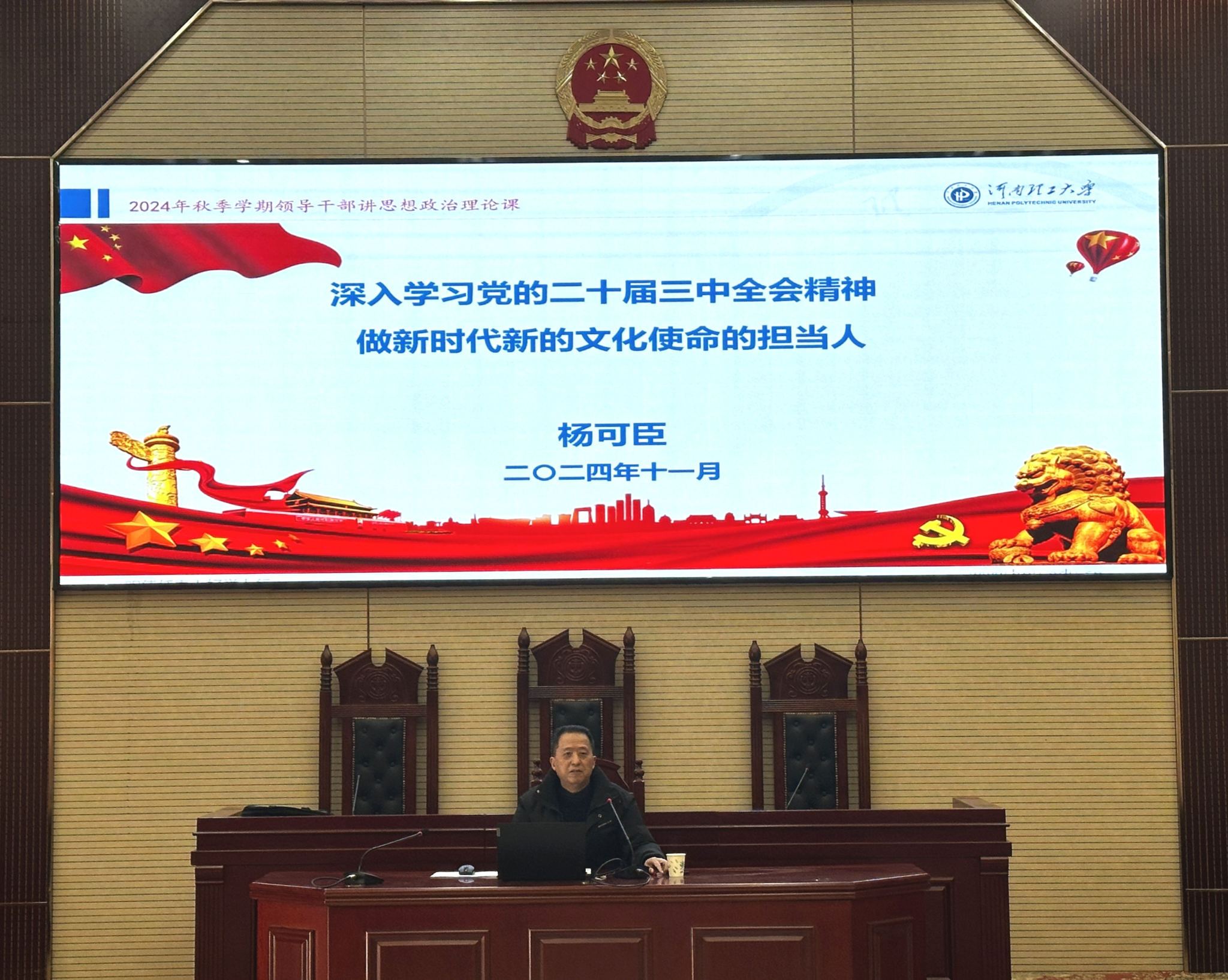 为深入学习贯彻党的二十届三中全会精神,深刻领会全会的重大意义,11月22日,文法学院党委书记杨可臣在模拟法庭以“为深入学习党的二十届三中全会精神,做新时代新的文化使命的担当人”为题为全体研究生讲授思政课。
