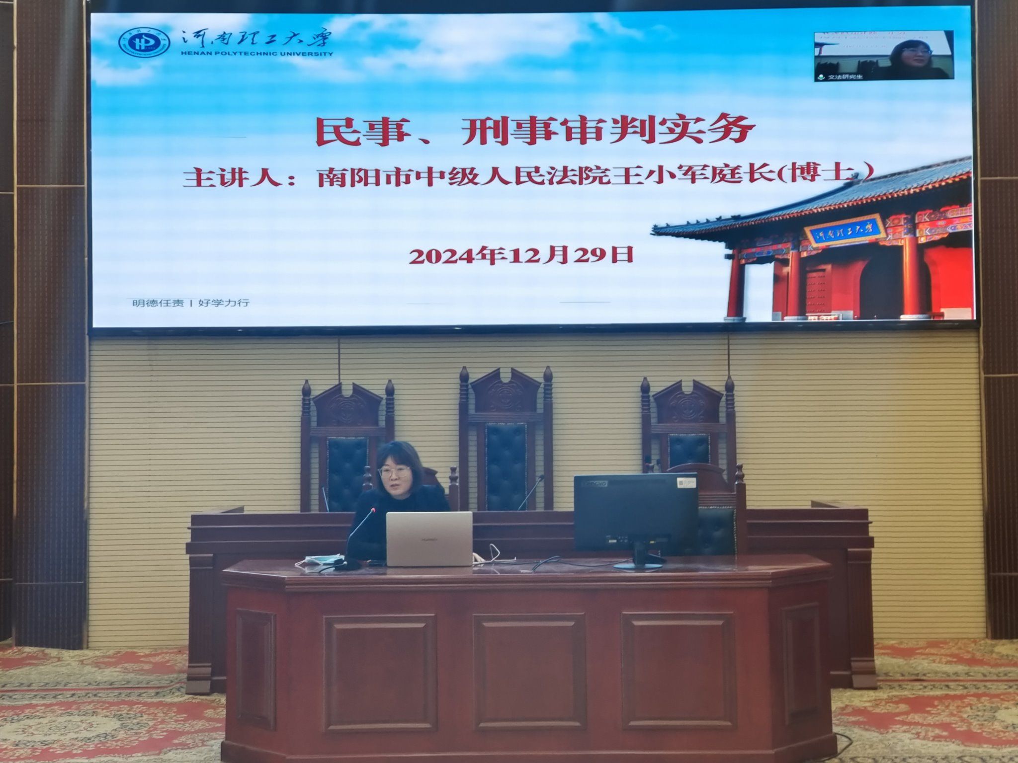 12月29日,南阳市中级人民法院王小军庭长应邀到河南理工大学文法学院开展讲座,讲座由文法学院副教授王丽娜主持,2023级法律硕士全体学生参加。
