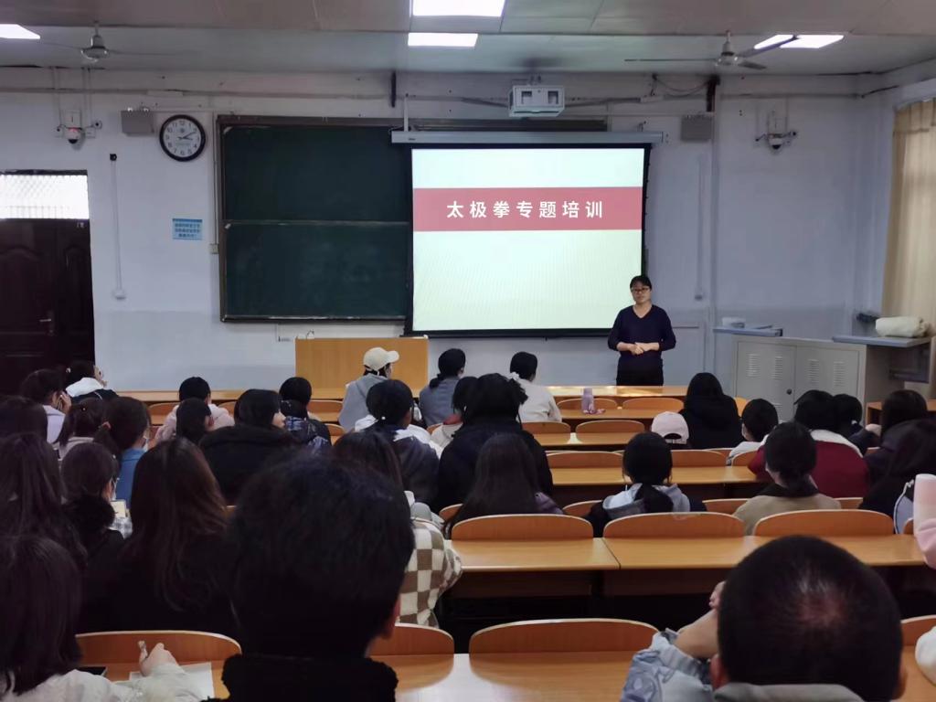 为丰富学生体育生活,有效提高学生身体素质,进一步推动太极拳活动深入开展,助力健康校园建设,2020年9月25日下午,文法学院于1101教室举办太极专题培训活动,院团委书记刘蓝蓝担任主讲,2021级全体同学到场聆听。