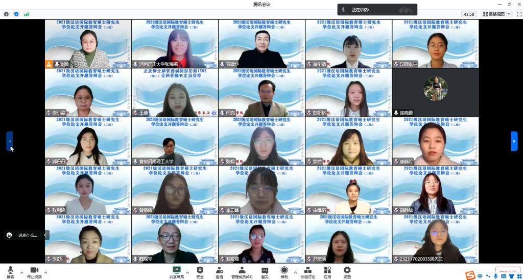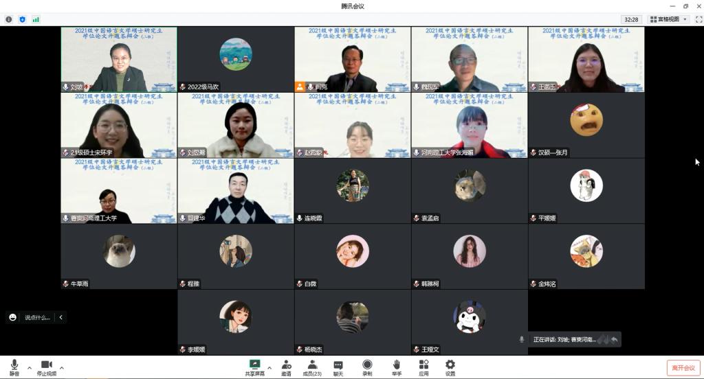 研究生学位论文开题是研究生培养工作的重要环节,是保证研究生学位论文质量的重要前提,为切实做好研究生学位论文指导工作,保证研究生培养质量,结合疫情防控工作要求,11月25日-11月29日,中国语言文学、汉语国际教育两个专业的2021级硕士研究生学位论文开题答辩会于云端顺利开展。为保证开题质量,此次开题根据专业方向分为四组,特邀中国艺术研究院研究员、教授张立敏、河南大学教授、博导辛永芬、河南师范大学教授连晓霞担任各组开题答辩评审。每位同学的开题包括个人汇报、专家质询与建议、学生答辩三项内容,时间不少于40分钟。