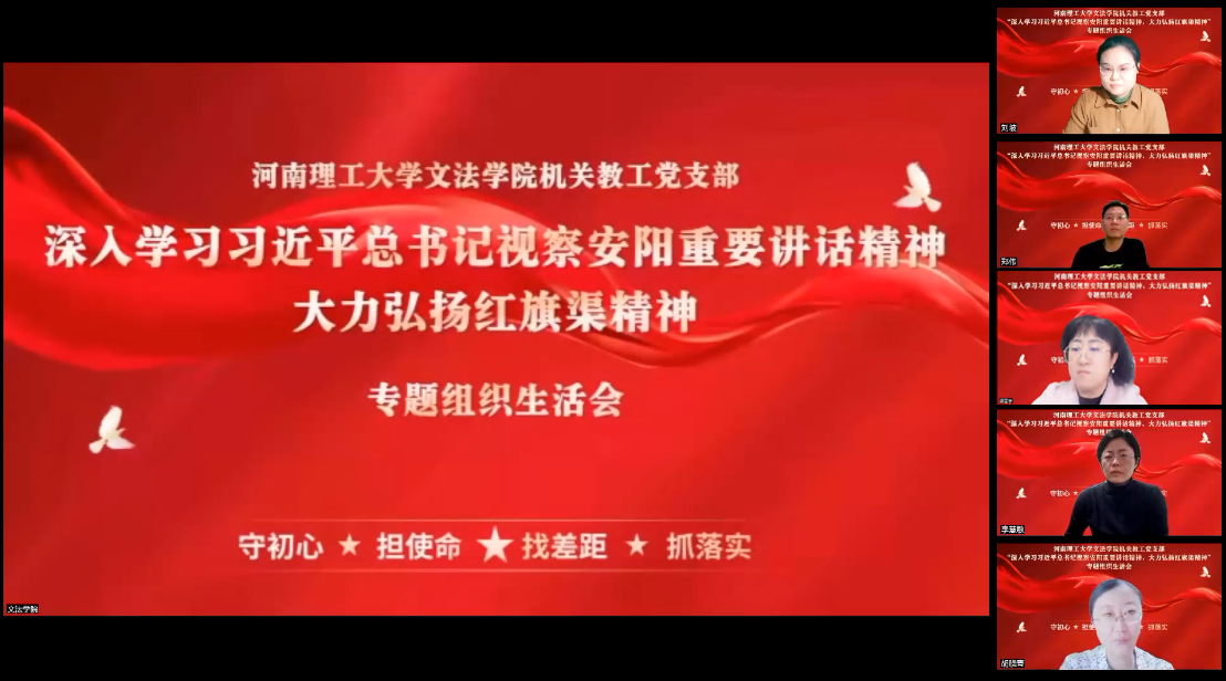 为深入学习贯彻党的二十大精神和习近平总书记视察安阳重要讲话精神,11月20日至29日,文法学院机关、中文系、法学系3个教工党支部和中文、法学、广告、研究生4个学生党支部相继召开“深入学习习近平总书记视察安阳重要讲话精神,大力弘扬红旗渠精神”专题组织生活会。学院领导班子成员以普通党员身份参加所在党支部的专题组织生活会。