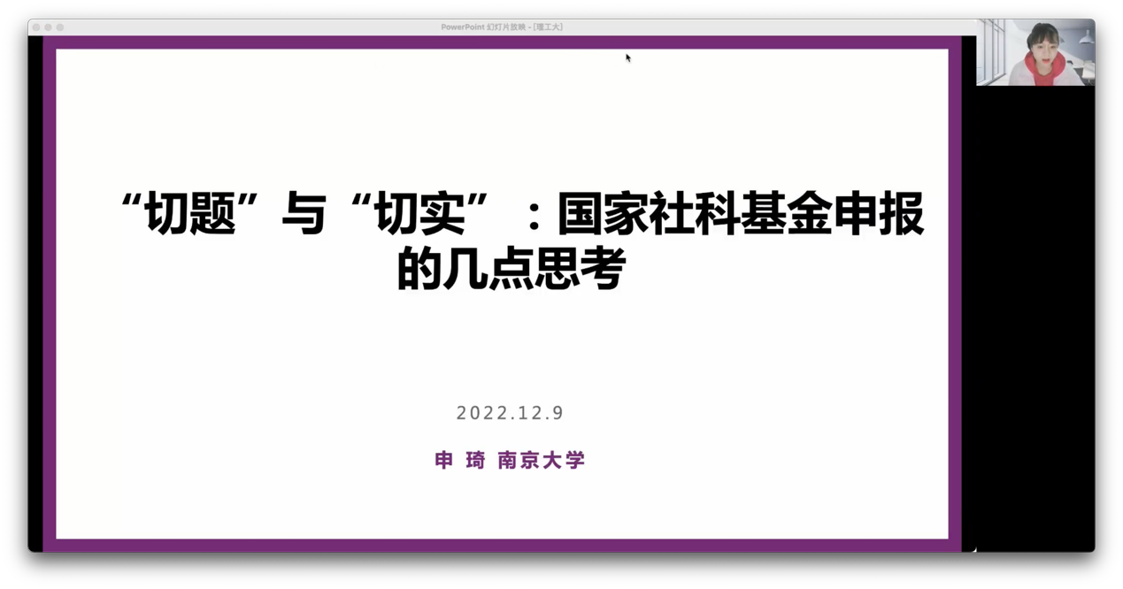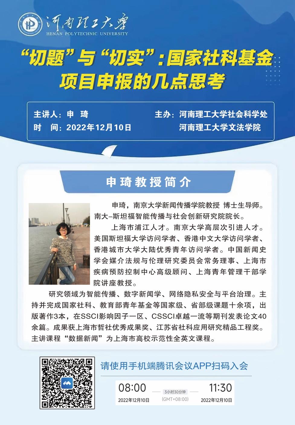2022年12月10日上午,南京大学申琦教授应邀参加我院“2023年度国家社科基金/教育部人文社科项目申报工作”的学术活动,为全体师生开设了题为《“切题”与“切实”:国家社科基金申报的几点思考》的学术讲座。我院全体研究生、教师均在线参与此次讲座。讲座由河南理工大学文法学院谢珺副教授主持。