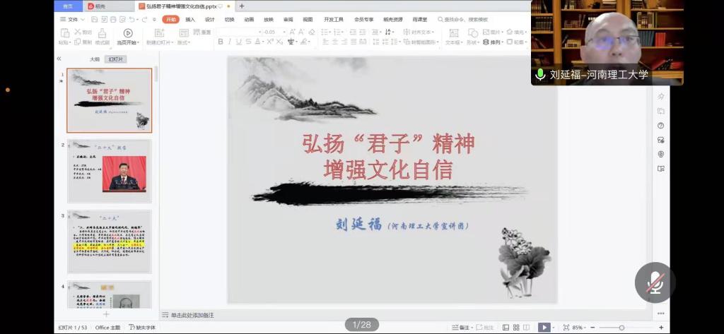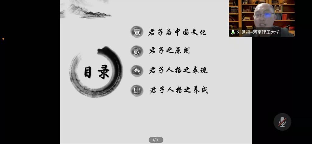 为学习宣传党的二十大精神,弘扬中华优秀传统文化,12月13日下午,学院中文系副主任、副教授刘延福受邀作题为“弘扬‘君子’精神,增强文化自信”讲座,讲座以线上形式开展,学院党委副书记郑伟主持,学院20级中文、广告专业以及全体研究生参加本次讲座。