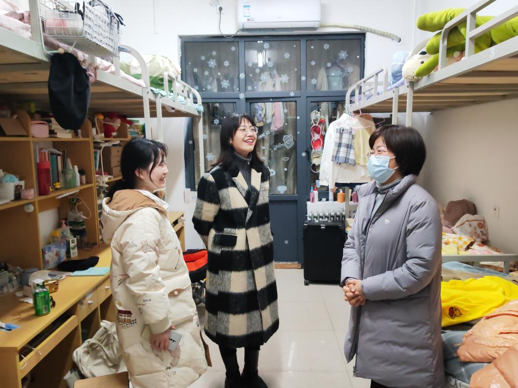 在1号女生宿舍公寓,李慧敏深入学生宿舍,看望慰问返校同学,与学生亲切交谈,“寒假过得怎么样?还有几门考试?宿舍同学都回来没?”学生一一回答,并对学院领导的关心和问候表示感谢。在5号男生宿舍公寓,郑伟在宿舍与学生交谈,询问学生的学习、生活、饮食等情况,并希望同学们珍惜大学时光、刻苦读书学习。