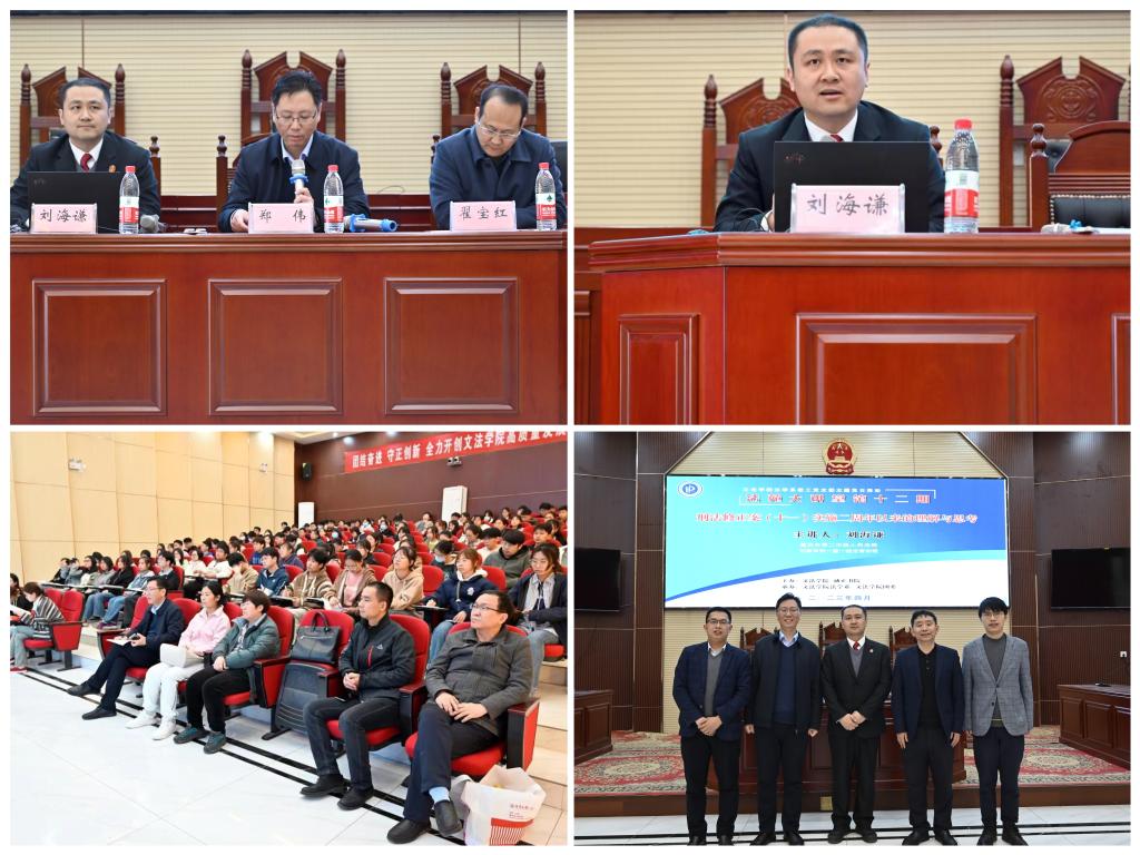 4月4日下午,文法学院第十二期“法苑大讲堂”在北校区模拟法庭成功举行。我院法学2008届优秀校友、重庆市第二中级人民法院刑一庭刘海谦法官应邀作了题为《《刑法修正案(十一)》实施二周年以来的理解与思考》的讲座,讲座由学院党委副书记郑伟主持,副院长谢珺、法学系党支部书记翟宝红、法学系副主任何平、部分教师和学生共计一百三十余人到场聆听。