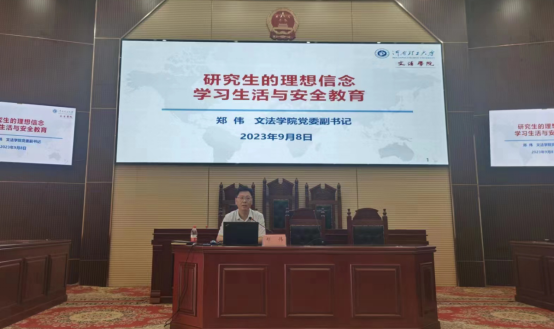 文法学院院长冒建华、院党委副书记郑伟、副院长曹爽,中国语言文学专业导师张海媚教授、郜书锴教授、朱智秀副教授、刘坡副教授,法律硕士专业导师何平,辅导员史艺等,分别围绕爱国心报国情强国志、爱校荣校教育与理想信念教育、专业教育与学术道德规范教育、安全教育与宗教防范教育、《研究生手册》学习教育、研究生日常心理素质教育等主题,给2023级研究生上来开学第一课。学院领导和各位导师的报告主题鲜明、内涵深刻、内容丰富,既有理论高度,又有实践深度,还有生活温度,贴近学术、贴近生活、贴近实际,为2023级研究生开始新的学习生活提供了指导和遵循。