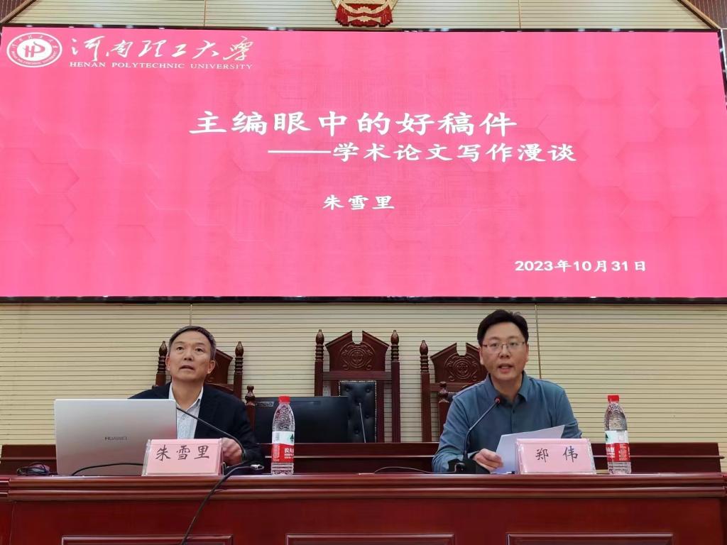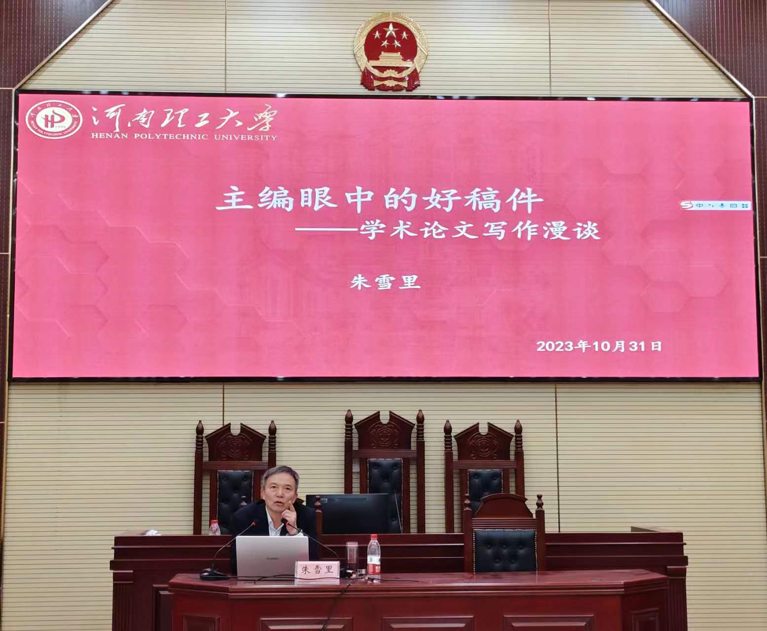 10月31日下午,文法学院邀请学院组织员、河南诗词学会常务理事、焦作市作家协会副主席、学校党委宣传部原部长、学术出版中心原主任(《河南理工大学学报》原执行主编)朱雪里在模拟法庭作题为《主编眼中的好稿件——学术论文写作漫谈》的讲座。学院党委副书记郑伟主持讲座,学院全体研究生和部分本科生到场聆听。