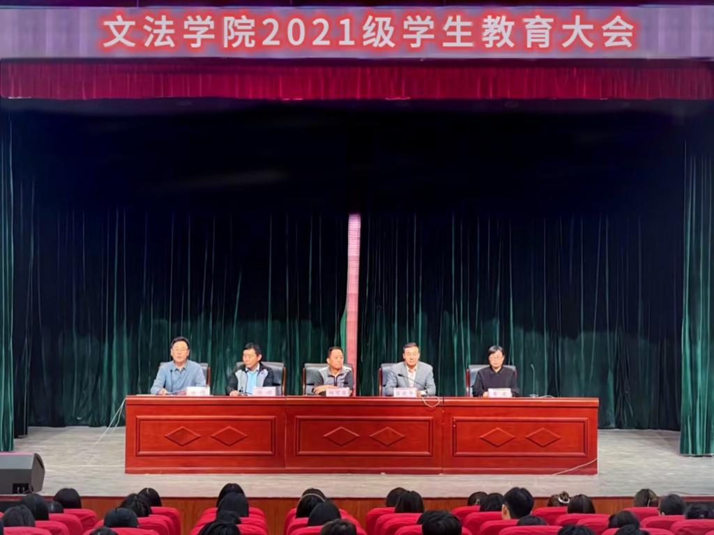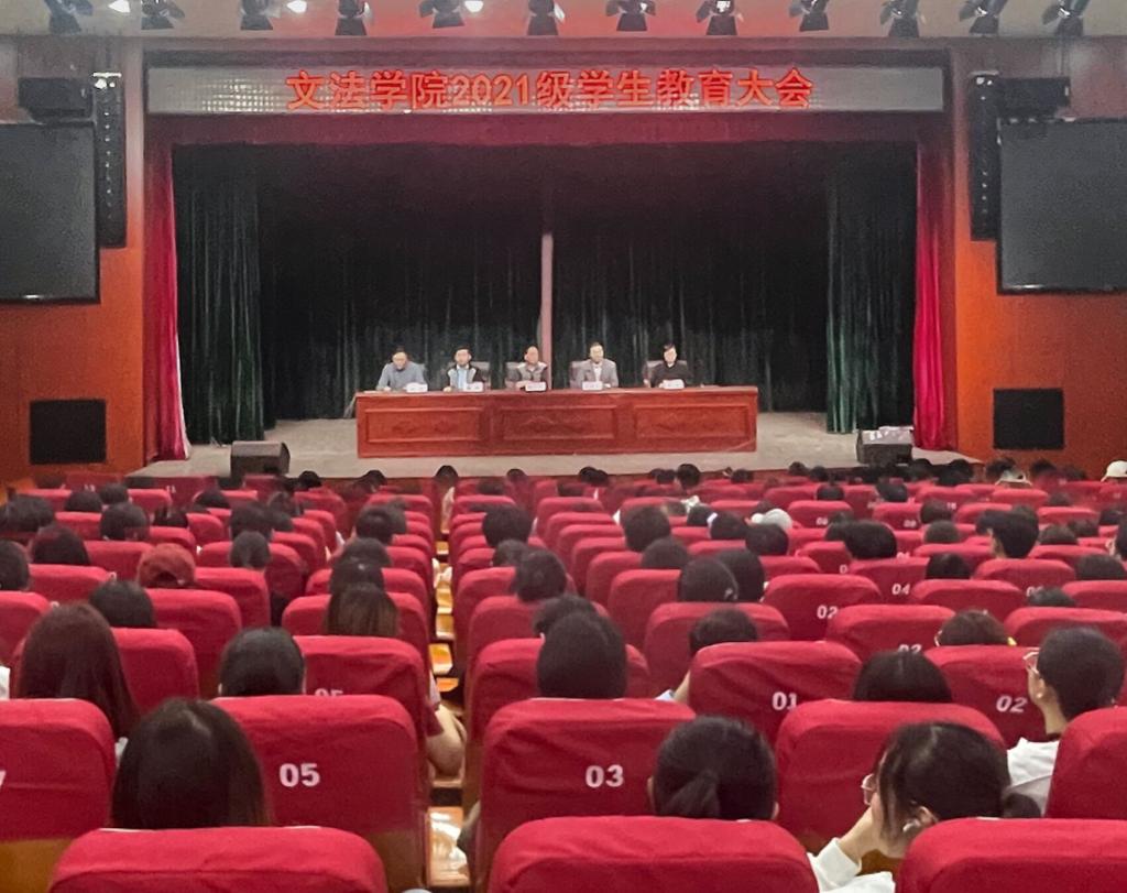 10月31日下午,文法学院在北校区小礼堂召开2021级学生教育大会。学院党委书记杨可臣、院长冒建华、党委副书记郑伟、副院长谢珺、副院长曹爽、辅导员闫芮和2021级230名学生参加了大会,会议由郑伟主持。