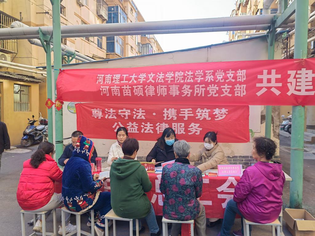 为深入学习贯彻习近平法治思想,大力弘扬法治精神,不断深化普法教育,11月23日下午,文法学院法学系党支部与河南苗硕律师事务所党支部到焦作市解放区陶瓷路社区联合开展义务普法咨询活动。