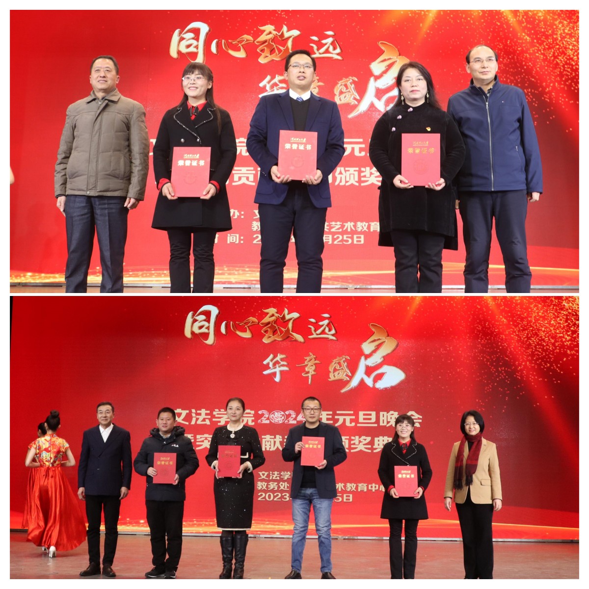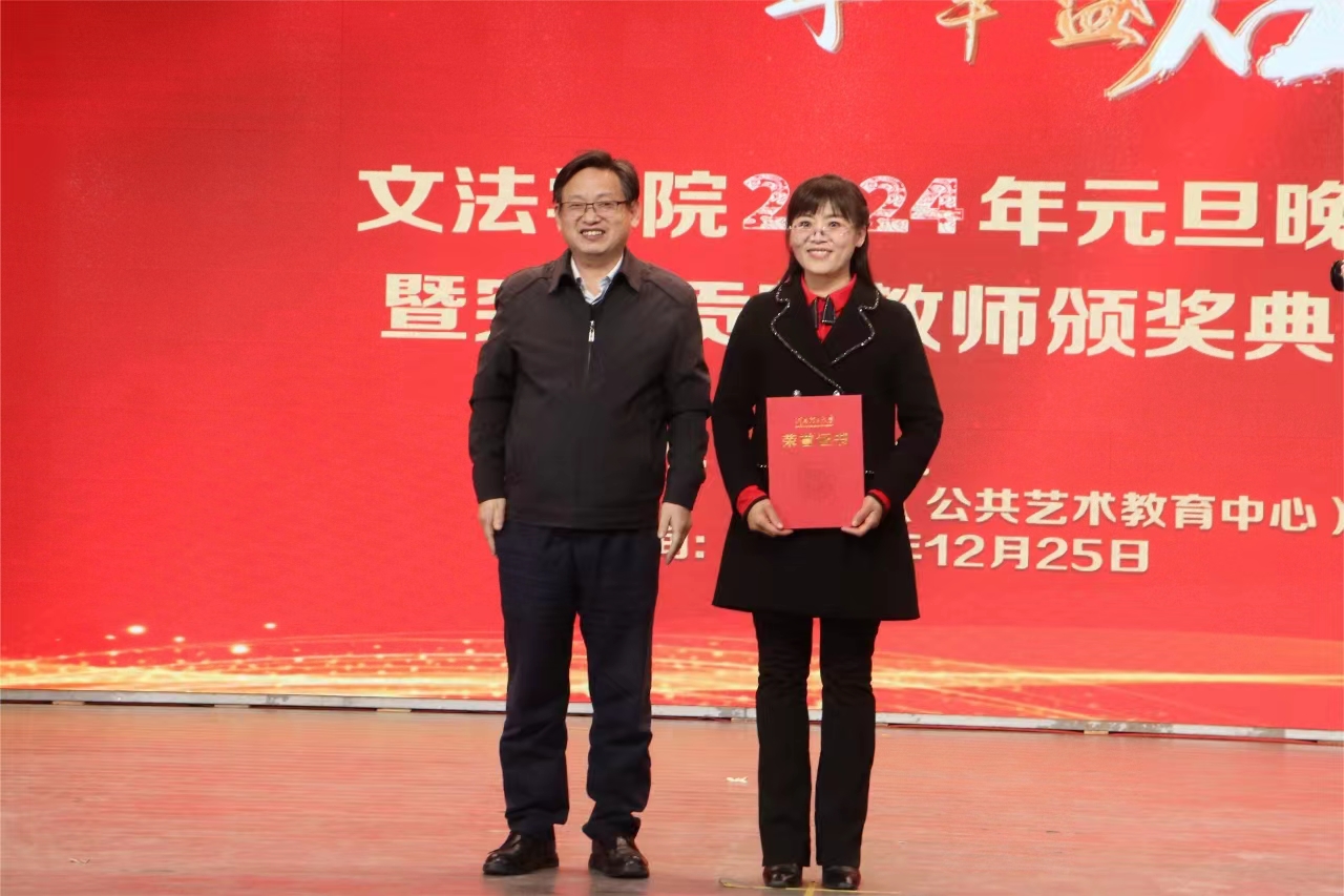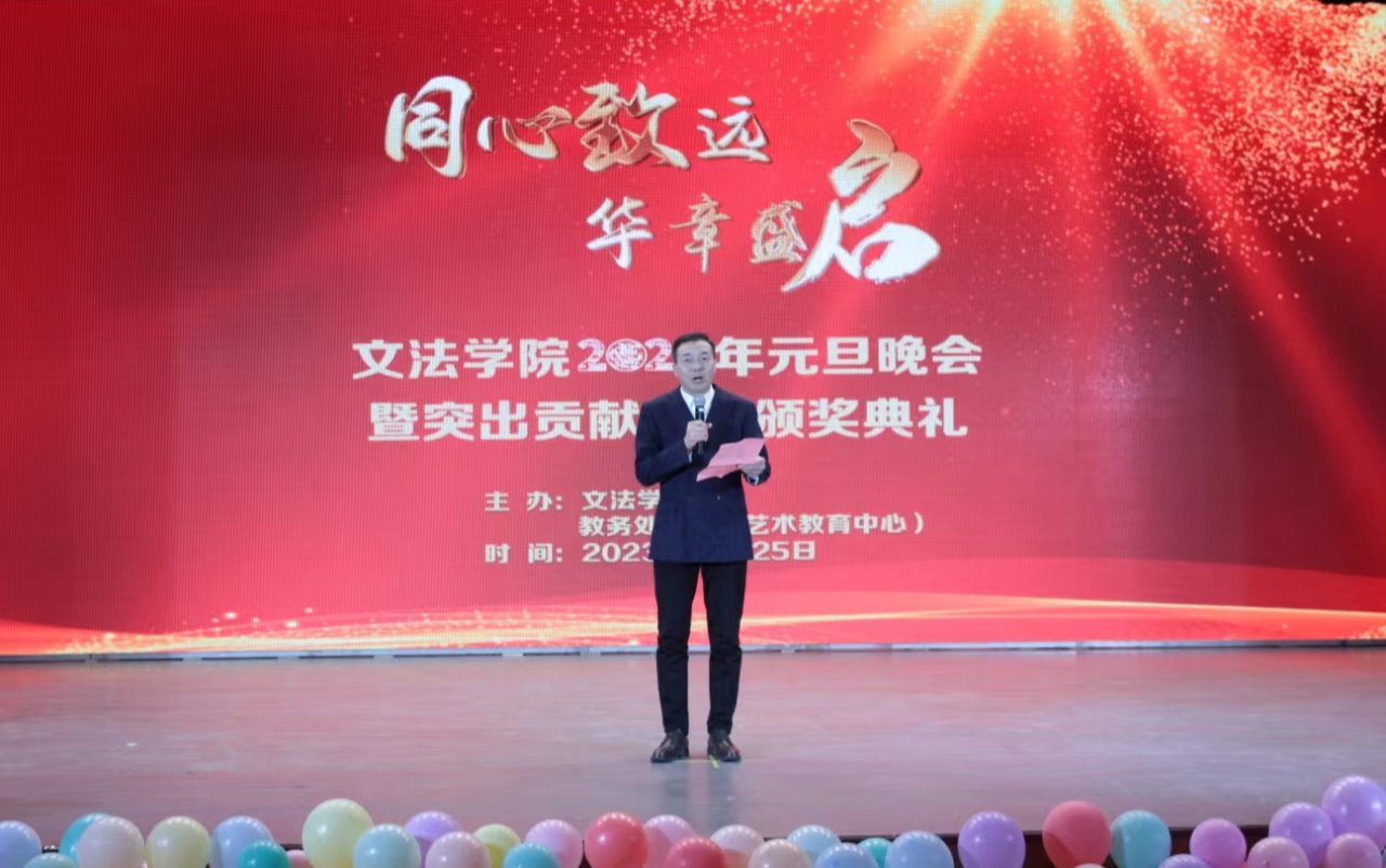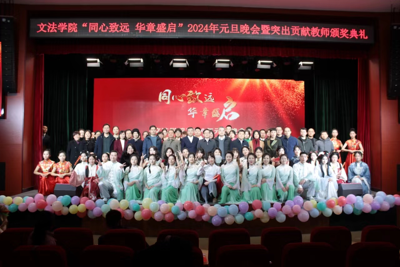 “欢歌曼舞庆佳绩,辞旧迎新展宏图”,为迎接2024元旦的到来、表彰过去三年为学院作出突出贡献的教师,12月25日晚,由文法学院、教务处(公共艺术教育中心)主办的文法学院“同心致远 华章盛启”2024年元旦晚会暨突出贡献教师颁奖典礼在北校区小礼堂成功举办。校纪委书记赵晓军,教务处处长牛海鹏,社会科学处处长张合兵,研究生院院长陈俊杰,国际交流合作处处长、国际教育学院院长李新娟,学生工作部部长、学生处处长陈昊,校团委书记支光辉,校纪委综合室主任郭兰英,公共艺术教育中心主任、教务处副处长孙娟,以及学院党委书记杨可臣,院长冒建华,党委副书记郑伟,副院长谢珺、曹爽与四百余名师生欢聚一堂,迎接新年的到来。