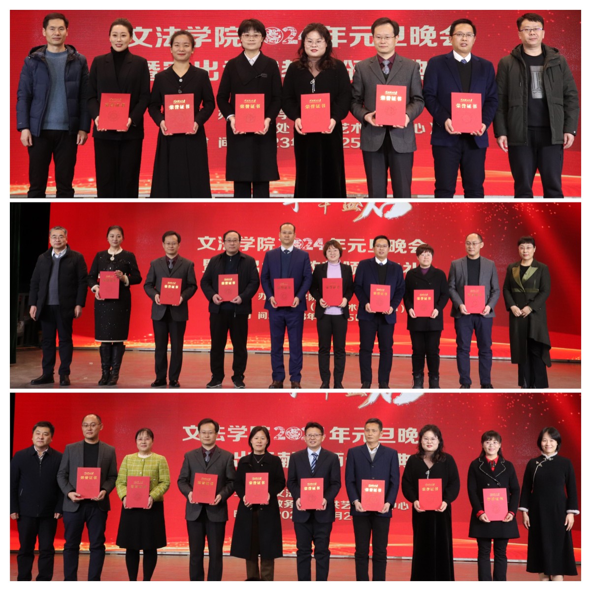 晚会为过去三年为学院做出突出贡献的教师进行了颁奖。赵晓军为高层次人才项目获得者张海媚颁奖。陈昊、支光辉为省级及以上党建、思政等工作获奖者何平、闫克、刘坡、刘蓝蓝、陈淼、史艺颁奖;牛海鹏、孙娟为省级教学项目获得者(项目代表)刘延福、王宏、王丽娜、何平、翟宝红、邢怒海、闫克、赵霞颁奖;张合兵、郭兰英为河南省哲学社会科学规划项目、河南省高等学校哲学社会科学基础研究重大项目、河南省高校中华优秀传统文化传承发展专项课题重点项目、河南省兴文化工程文化研究专项项目等获得者张海媚、刘坡、肖伟韬、张清河、冯舒冉、闫克、朱智秀、刘延福颁奖;陈俊杰、杨可臣为河南省社会科学优秀成果奖获得者姚军玲、何平、张海媚颁奖;李新娟、冒建华为国家级教学科研项目获得者张海媚、魏现军、赵霞、陈正正颁奖;获奖教师代表赵霞、魏现军、张海媚分别发表感言。