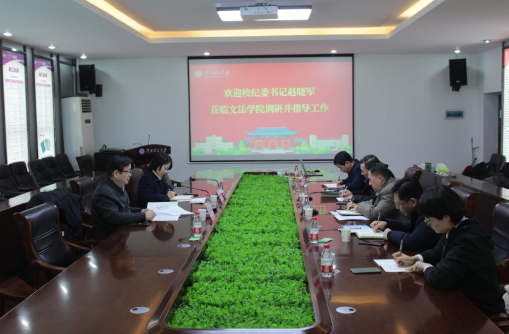 12月25日下午,校纪委书记赵晓军到文法学院调研并指导工作,实地考察学院软硬件设施建设情况,并与学院领导班子成员交流座谈。