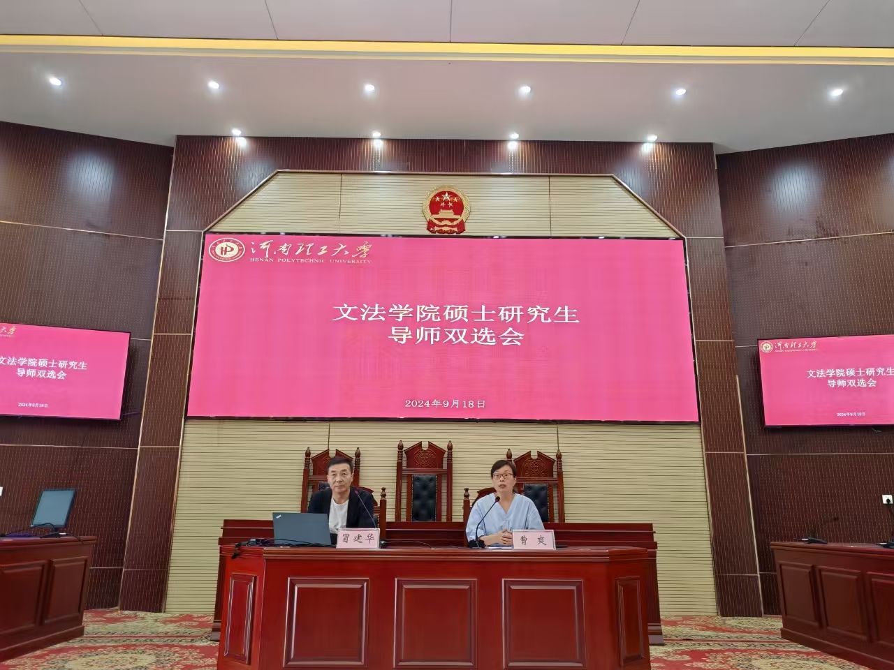 9月19日下午,文法学院2024级硕士研究生导师双选见面会在学院模拟法庭顺利召开,文法学院院长冒建华,副院长曹爽,全体研究生导师及64名研究生新生参加了本次见面会。本次会议由曹爽主持。