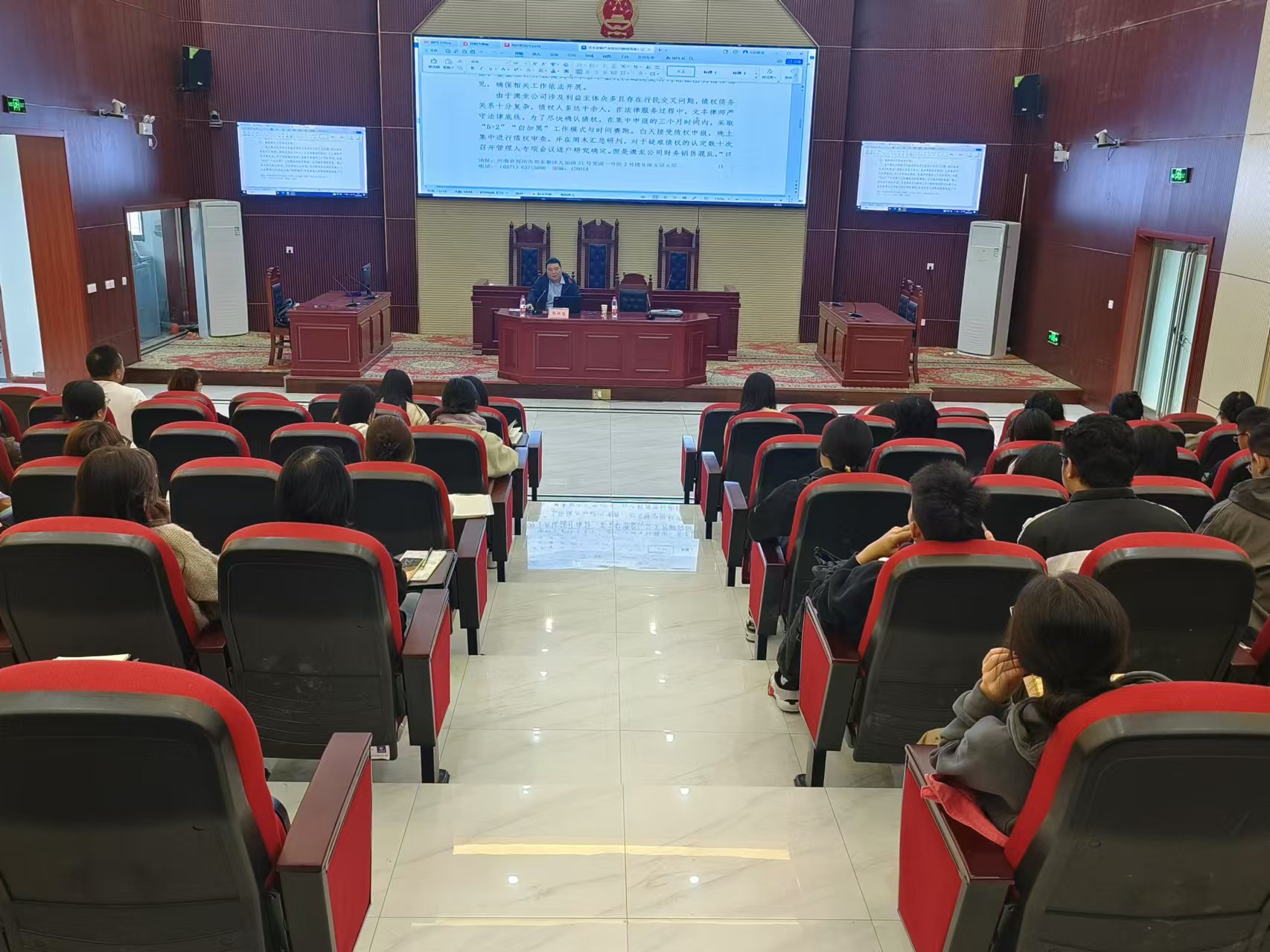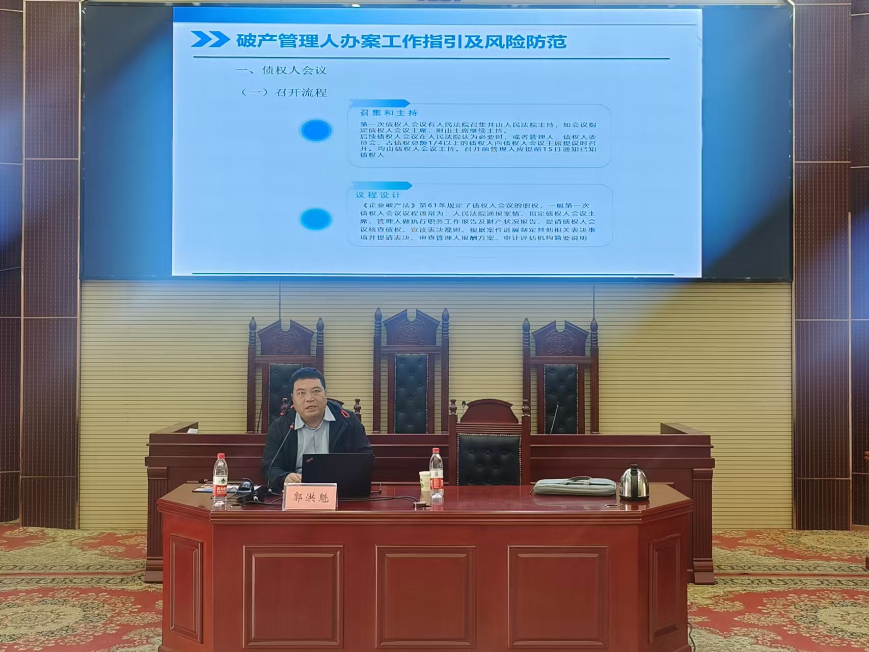 2024年10月19日上午,河南文丰律师事务所郭洪魁主任莅临我院模拟法庭为师生作了一场关于《破产管理人办案工作指引及风险防范》的专题讲座。讲座由文法学院王丽娜老师主持,23级、24级法律硕士及部分本科生共计120余人参会。