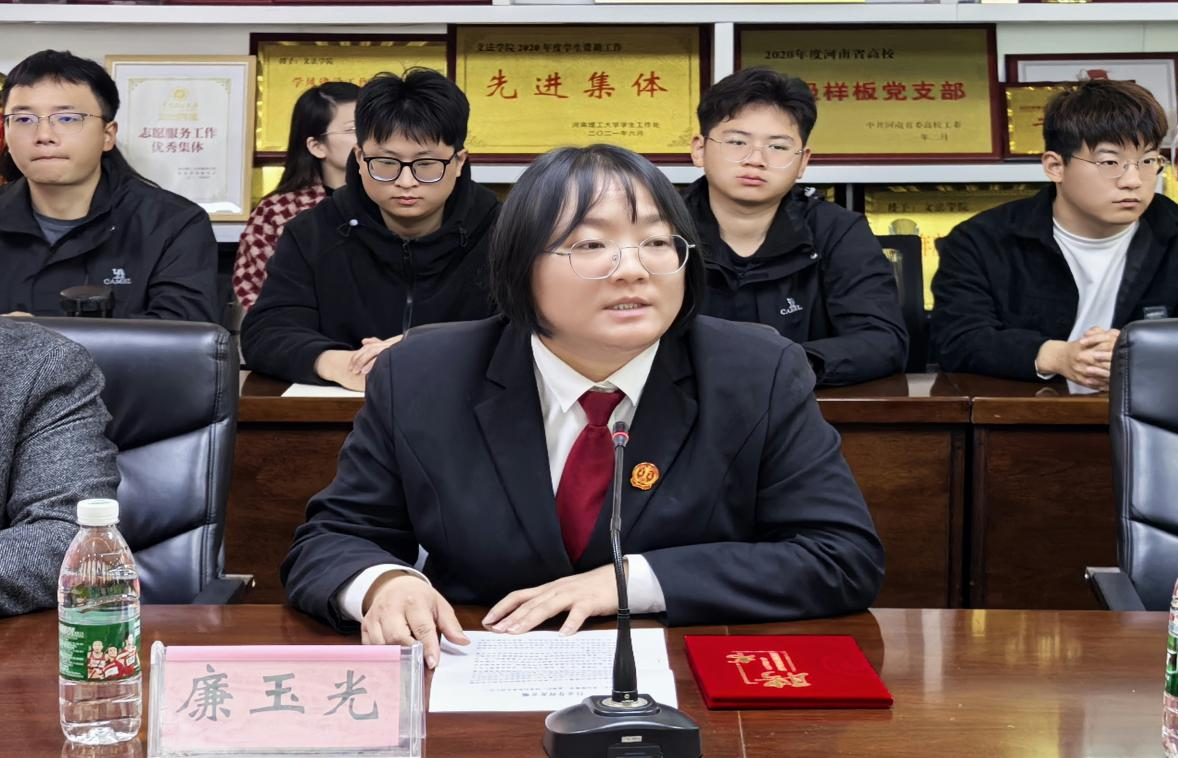仪式分四个议程。首先,院长冒建华教授发表讲话。他介绍了河南理工大学百余年办学历史及文法学院的发展沿革,重点介绍了中国语言文学、国际中文教育和法律三个硕士研究生学位点的建设成果。接着,曹院长宣读聘任决定及导师名单,冒院长为每位导师颁发聘书并合影留念。仪式的第三项内容是曹院长向导师宣读《文法学院硕士研究生校外指导教师年度考核办法》,要求各位导师严格要求自己,强化导师责任意识,确保研究生培养质量。随后,焦作市山阳区人民法院副院长廉玉光作为行业导师代表发表了感人至深的讲话。她对母校的发展成就表示由衷的欣慰和自豪,强调法学专业研究生实践能力培养的重要性,并代表校外导师郑重表态,将珍惜这份荣誉,认真履行校外导师职责,全力支持学院人才培养工作,为学院培养更多高素质人才贡献力量。
