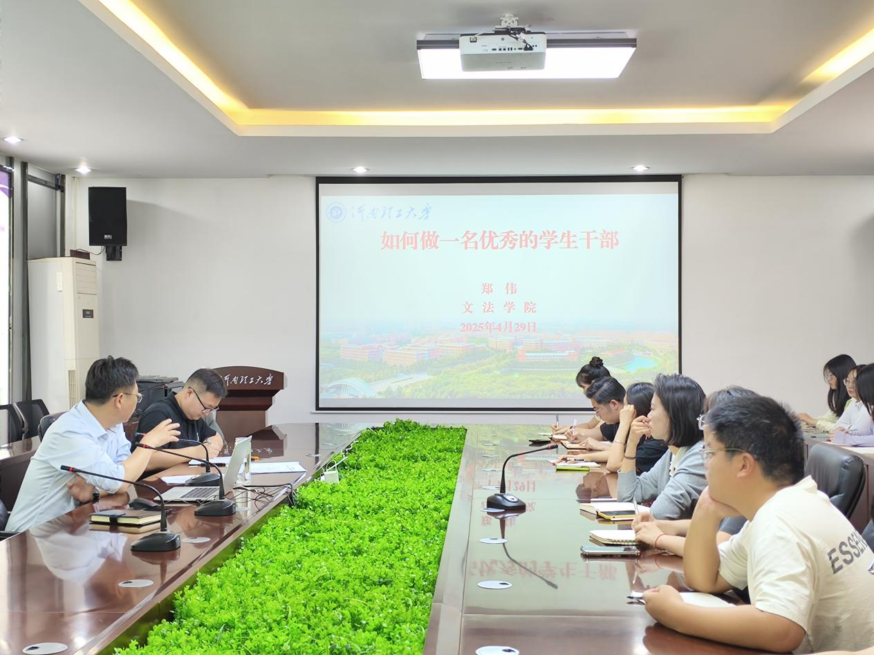 在五四青年节即将来临之际,为加强研究生干部队伍建设,提升研究生干部综合素质与工作能力,4月29日下午,文法学院党委副书记郑伟在121会议室为学院研究生干部作题为“如何做一名优秀的学生干部”专题讲座,在校的研究生会干部和2023级、2024级班干部以及党员参加培训。