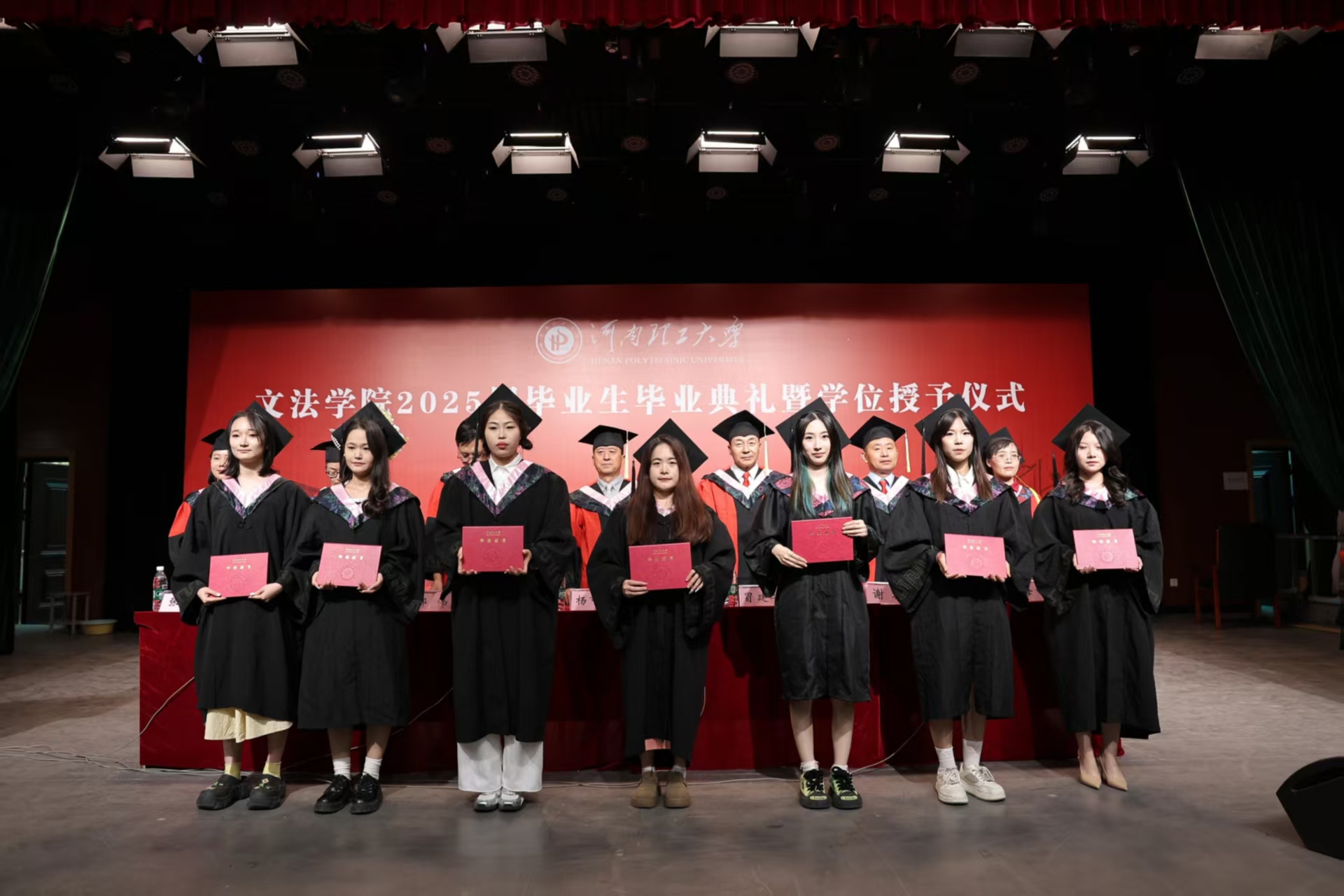 在雄壮的国歌中,仪式正式拉开帷幕。谢珺、曹爽先后宣读了学院获评河南省优秀毕业生推荐名单、《河南理工大学关于表彰2025届优秀本科毕业生的决定》。学院领导依次为2025届毕业生代表颁发毕业证书,为毕业生代表拨苏正冠并颁发学位证书,为2025届校级优秀毕业生代表颁发荣誉证书。