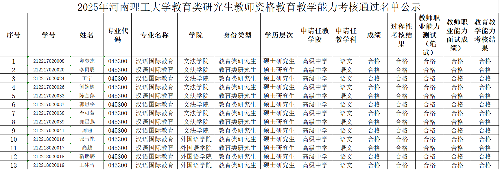 根据《关于组织2025届教育类毕业研究生教育教学能力考核的通知》(研培养﹝2025﹞5号 )要求,文法学院对申请此次考核的14名2022级教育类毕业研究生进行了过程性考核,并于4月21、24日组织了教育教学能力笔试、面试,其中1名研究生因个人原因放弃此次申请,未参加教育教学能力笔试及面试。经综合评定,13名研究生教育教学能力考核结果合格,现予以公示,如有异议,请于2025年4月29日前以电话或书面形式(署名)向文法学院研究生管理办公室反映。
