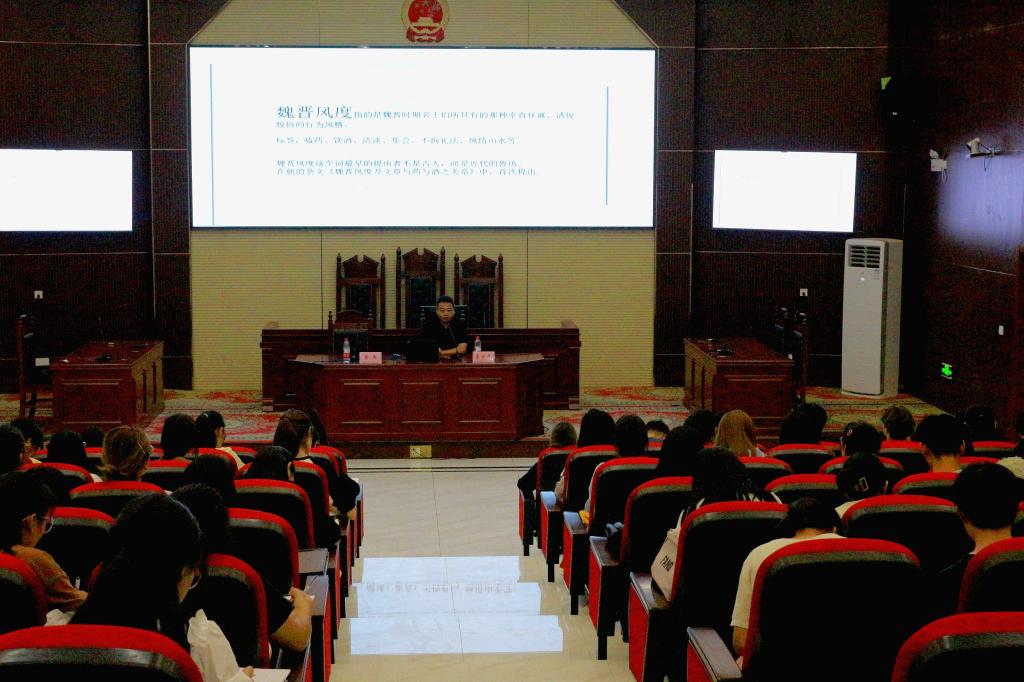 9月13日下午,社科普及周中原大讲堂焦作名家讲堂系列讲座在北校区模拟法庭举行。此次讲座由焦作社科联、河南理工大学社科联和文法学院主办。焦作市诗词学会秘书长、焦作市作协副主席李乐观老师应邀做了题为“云台山下的魏晋风度”的精彩讲座,讲座由文法学院副院长曹爽主持。