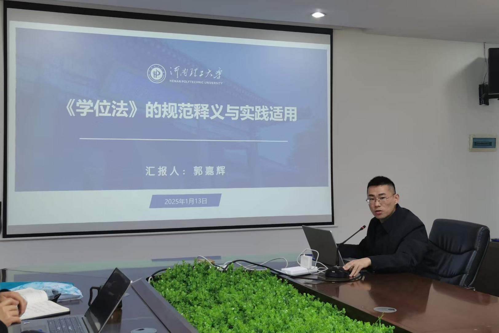 深入学习贯彻《中华人民共和国学位法》,准确理解法律规定,提高青年教工的法律意识,确保合法地进行研究生教育与学位授予工作,1月13日下午,文法学院法学系教师郭嘉辉博士为青年教工作了“《学位法》的规范释义与实践适用”的专题报告。报告由文法学院副院长曹爽教授主持。