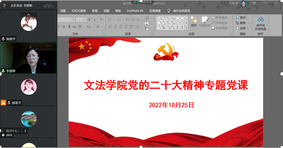 12月25日下午,文法学院通过线上会议的形式举行了党的二十大精神专题党课,学院党委书记以《凝聚新力量奋进新征程》为学院全体教工党员讲授党课。