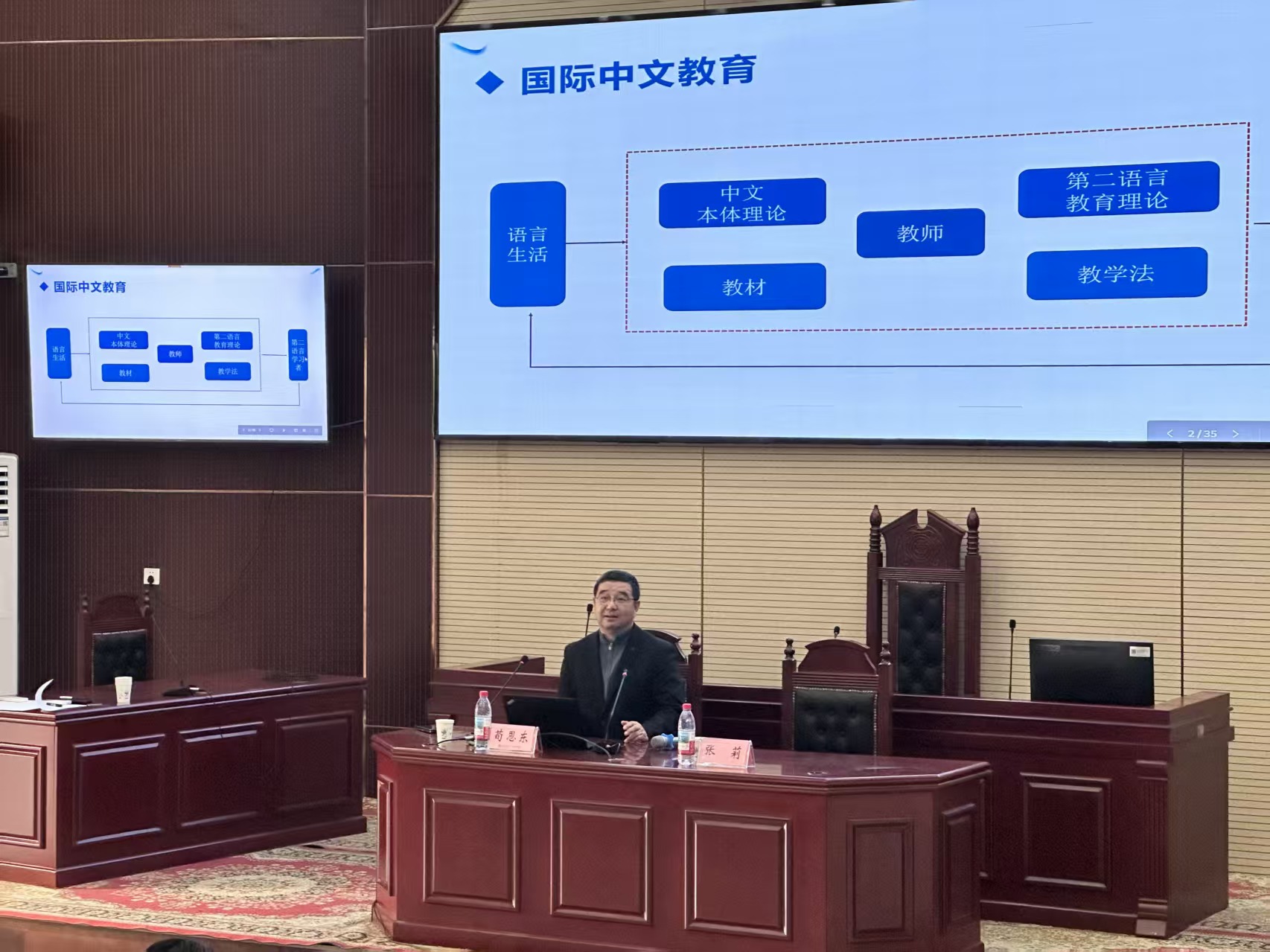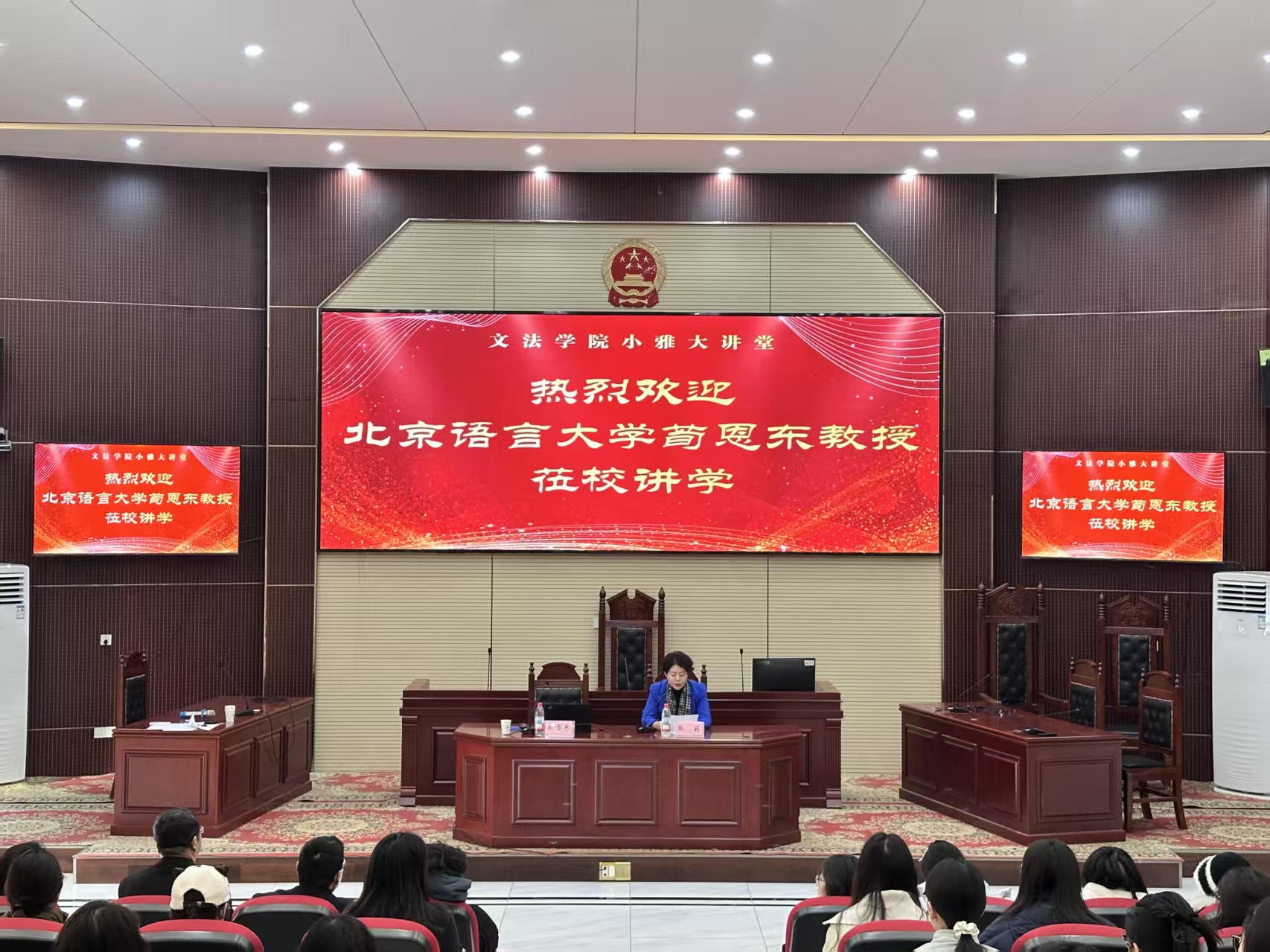 12月11日上午,文法学院在模拟法庭举行第73期“小雅大讲堂”,特邀北京语言大学教授、博士生导师荀恩东,作题为“国际中文教学数智化实践”的讲座。学术副院长张莉主持讲座。